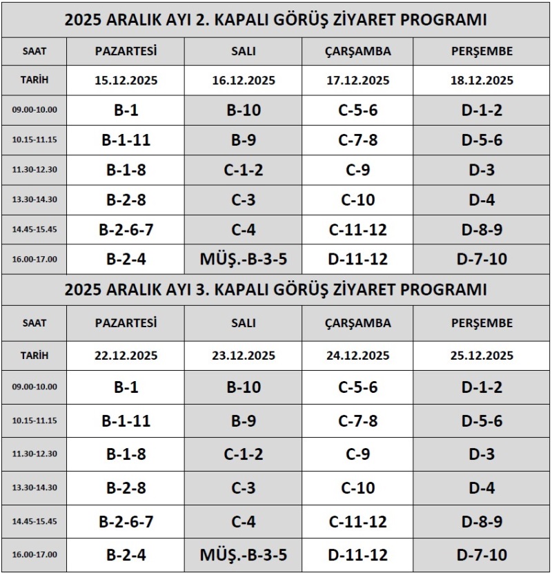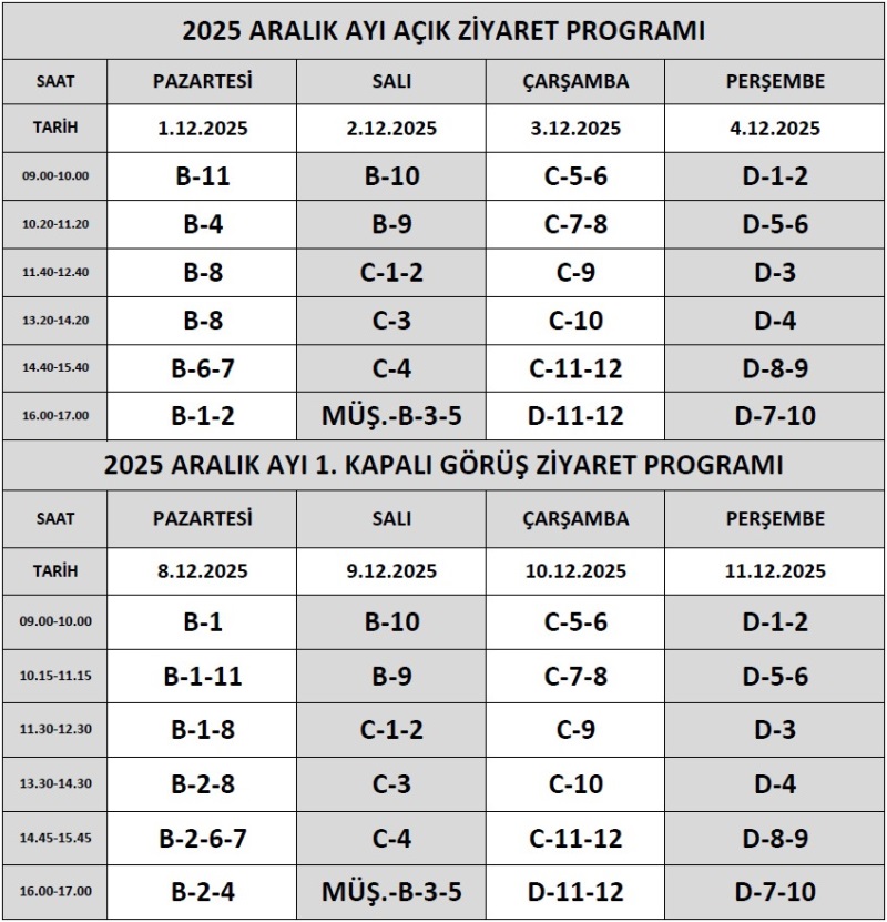 2025 YILI ARALIK AYI ZİYARET PROGRAMI